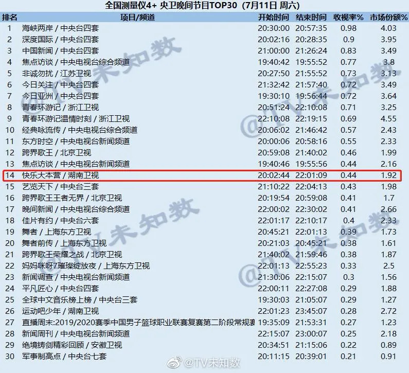 上周最新一期《快乐大本营》在全国网创下了节目近年来的收视新低!