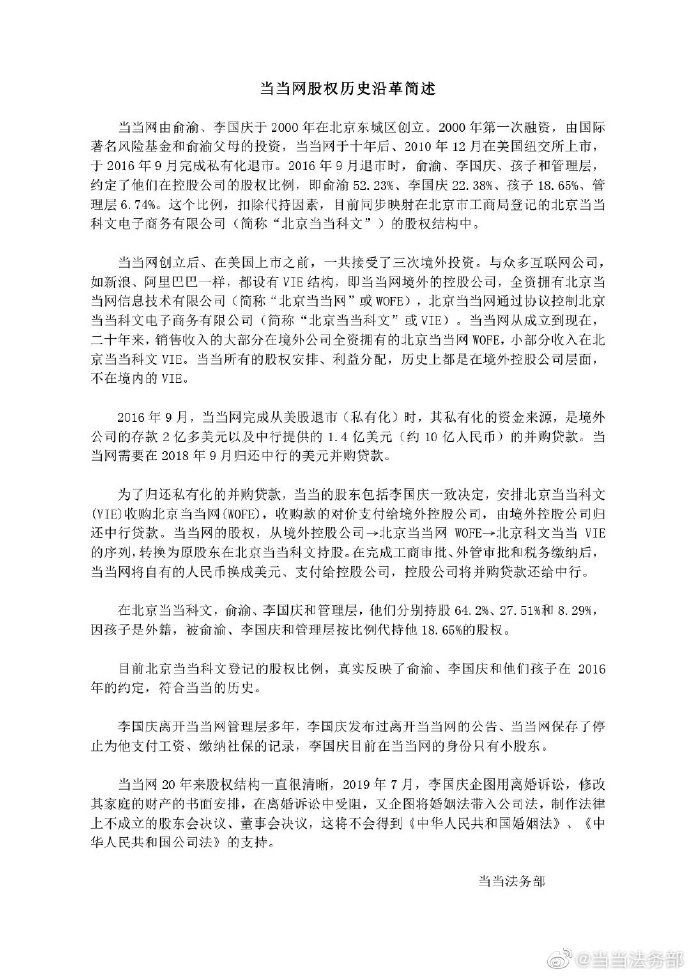 当当法务部16日晚在官方微博连发两篇长文,梳理了当当网20年股权历史沿革,并称当当网股东离婚诉讼不影响当当网的运营与治理结构。