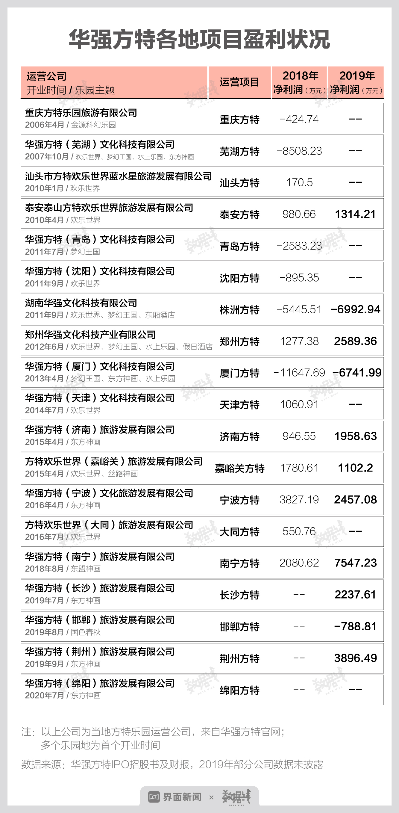 界面新闻记者梳理了华强方特旗下各主题公园运营公司的盈利状况。2018年所有营业中的主题公园净利润之和为263万元,如果加上在建的乐园,整体处于亏损状态。
