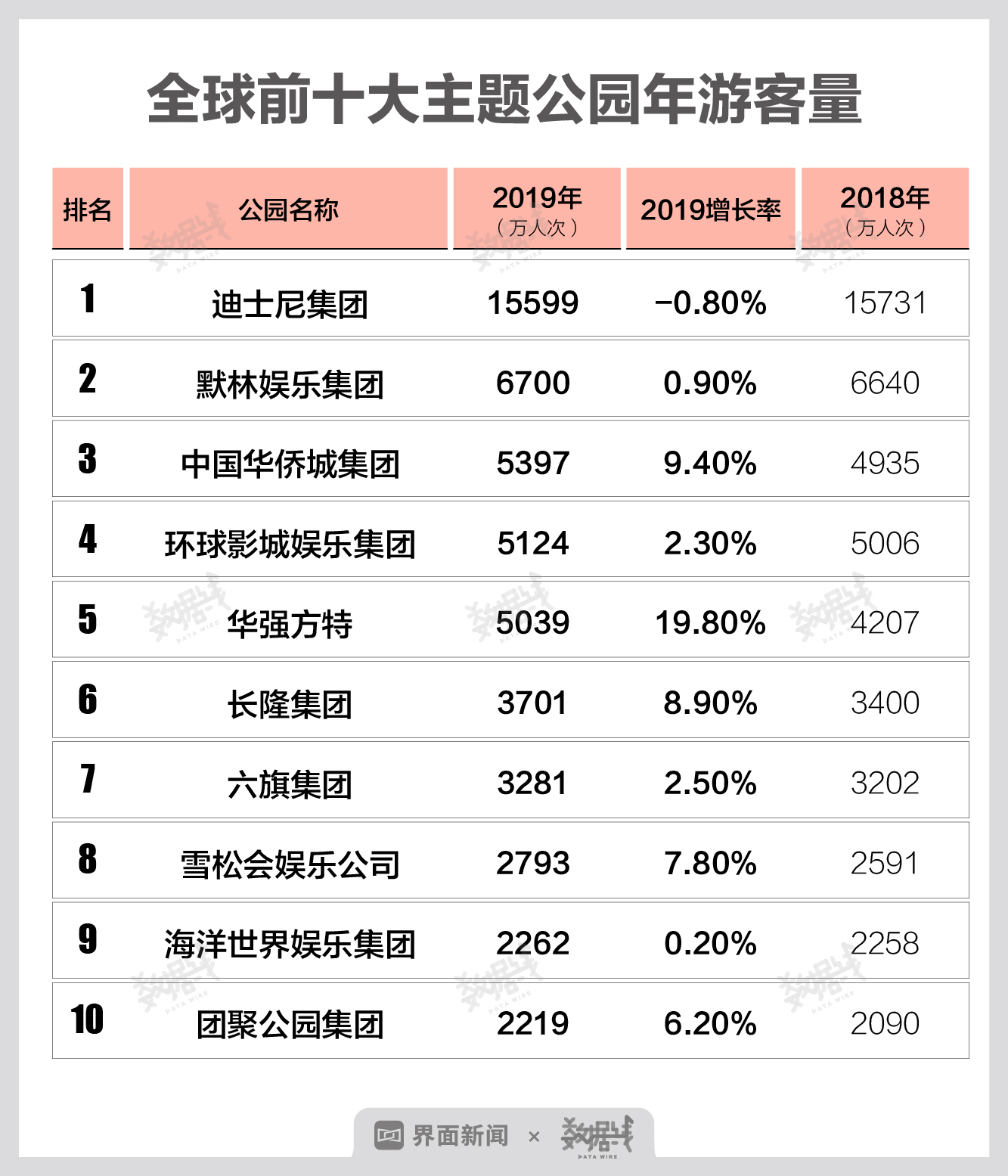 整体上而言,中国主题公园游客量增长速度高于国外。中国公司华侨城(欢乐谷母公司)和长隆集团,2019年游客增长率都在9%左右,其中华侨城的排名由2018年的第四名上升到了第三名。