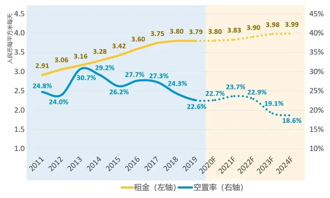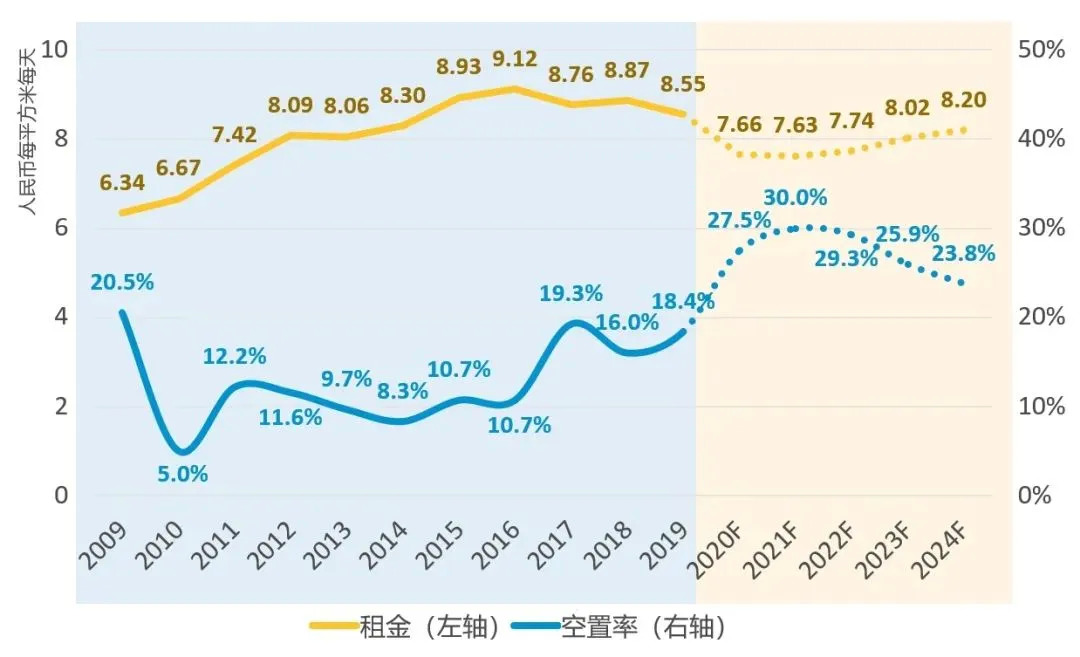 受供应高峰和新增需求不足影响,高力国际预计到2020年底上海写字楼空置率持续推升至27.5%,而后继续上涨在2021年触及高点达到30%,与此同时,租金也随之下调,有望在2021年触底反弹。