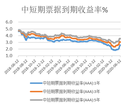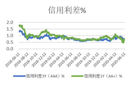 信用债跟随利率债走势,整体下行,但下行幅度不及预期,市场主要还是担心疫情对经济的冲击,进而引发部分中小企业信用违约出现,导致收益率不及预期。截至2020年6月12日,中短期票据AAA级1年、3年、5年曲线收益率分别为2.56%、3.02%、3.52%。