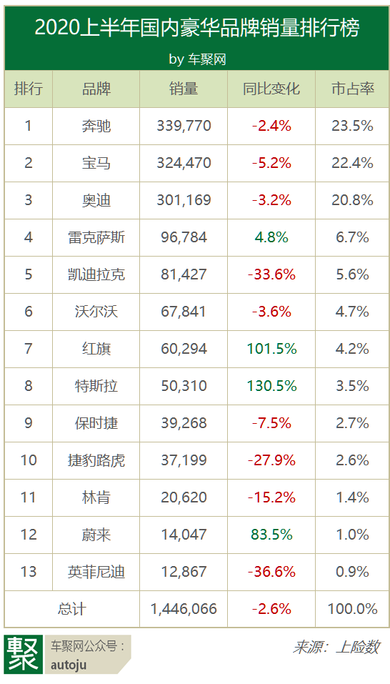 据上险数显示,2020上半年,国内主流豪华车累计销售144.61万辆,同比下滑2.6%。但表现远好于当期乘用车整体表现(上险数同比:-26.6%),两者相差24个百分点。