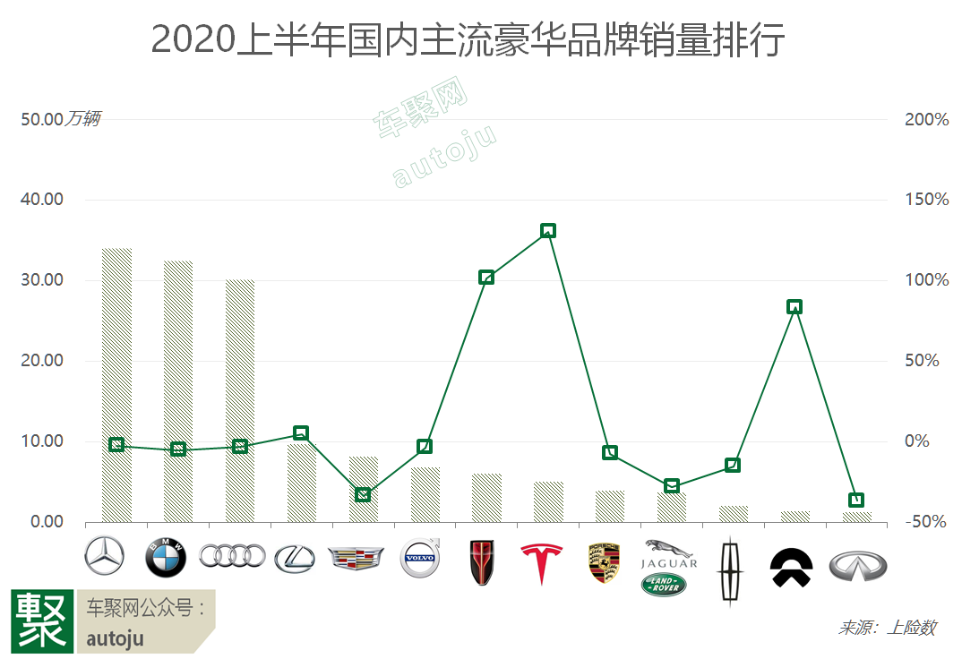 特斯拉是增速最高的一个豪华品牌,也是销量最高的电动车品牌。上半年共交付5万辆,同比暴增130%。这个销量与增幅都超过了保时捷和捷豹路虎。2020全年,特斯拉在华销量将超10万辆。