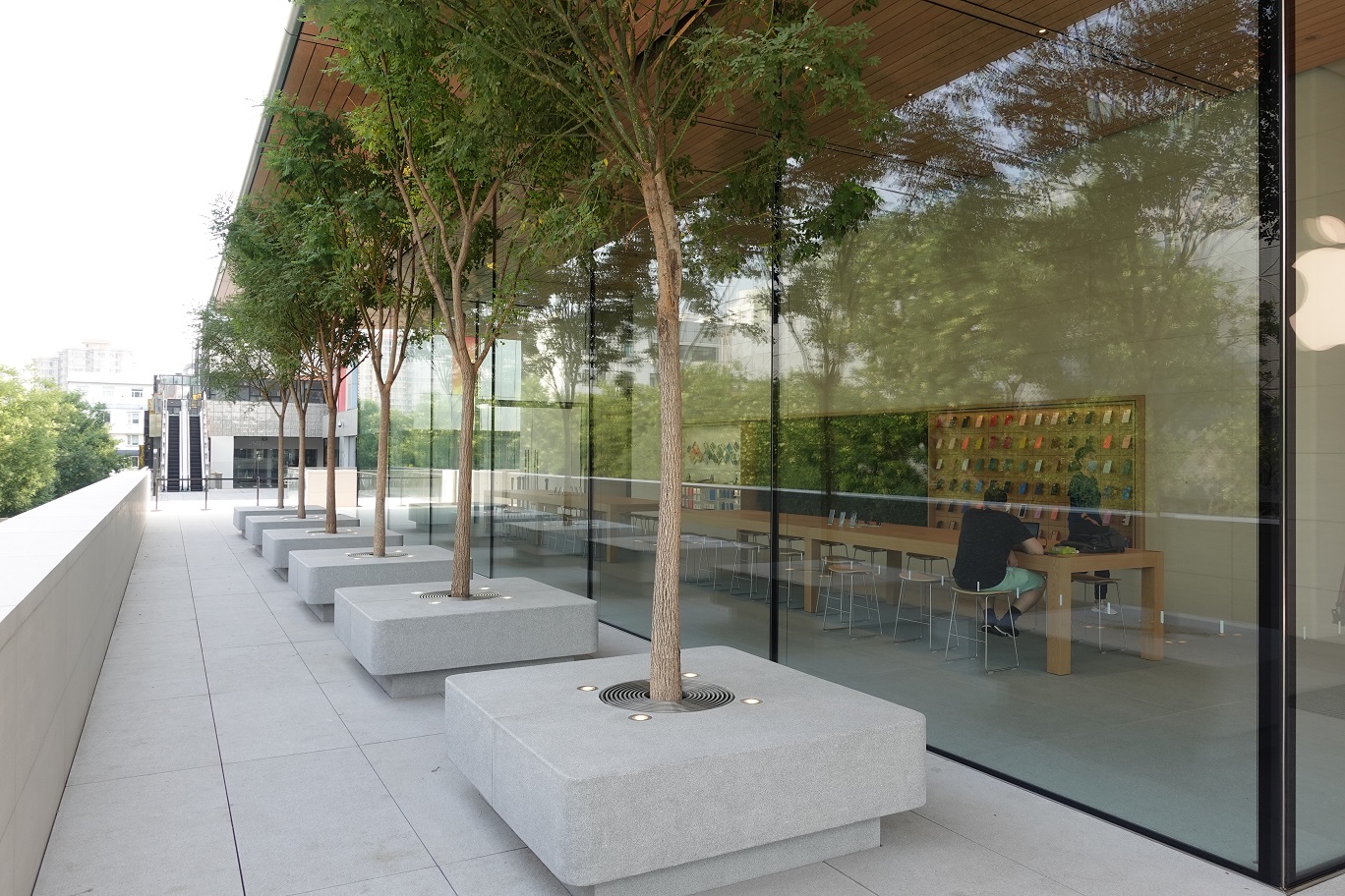 在整体设计上,三里屯Apple Store还加入了许多细节,例如二层露台上的树木选择了北京市市树——国槐;地板采用的是来自中国山东的巴东芝麻白花岗岩;提供了一个景廊为热闹的室外广场提供了一个绝佳的观景位置等等。