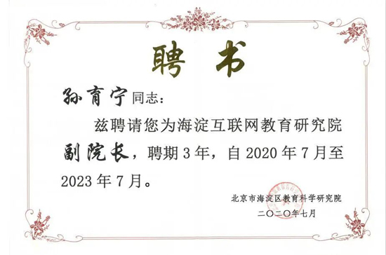 7月14日,北京市海淀区互联网教育研究院成立暨新技术应用高峰论坛举行。区委区政府、区教工委教委、区科信局主要领导,驻区高校科研院所、互联网企业、中小学代表参加活动。活动采用线上与线下相结合的方式同步进行,海淀区中小学校长在线上参与活动。活动由副区长张若冰主持。凭借在信息领域的卓越贡献及多年信息产业标准制定经验,闪联信息产业协会理事长孙育宁博士被聘为“海淀互联网教育研究院副院长”。
