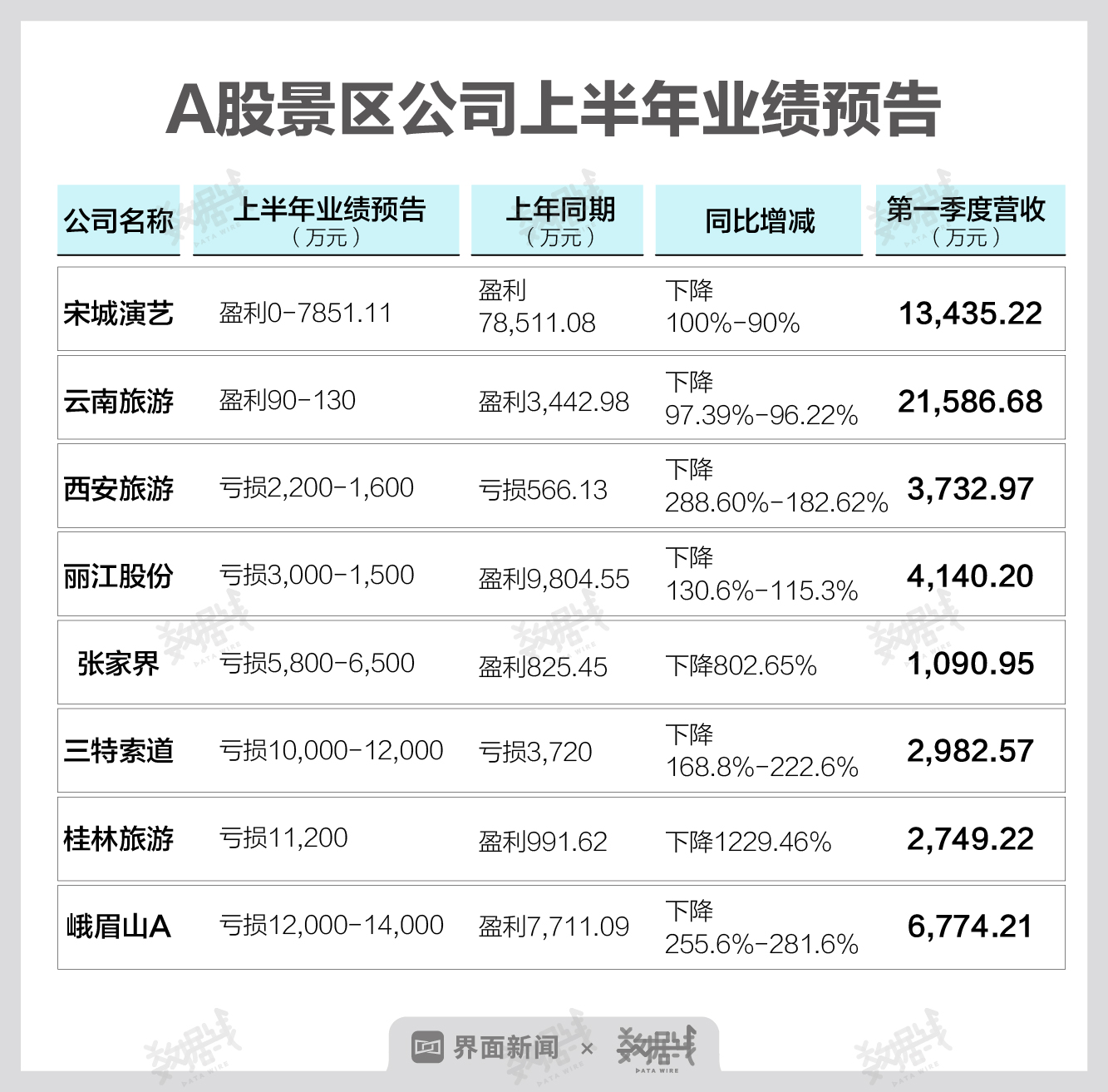 截至7月17日,峨眉山A、丽江股份、西安旅游、张家界、桂林旅游、三特索道、宋城演艺和云南旅游均已发布上半年业绩预告,其中前六家都将面临亏损压力,宋城演艺和云南旅游虽然预计上半年盈利为正,但同比下降均超九成。