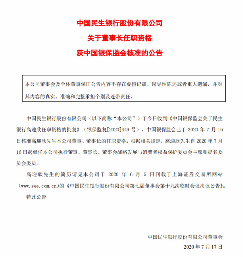 2020年7月17日,中国民生银行股份有限公司(以下简称“民生银行”)公告称,于今日收到《中国银保监会关于民生 银行高迎欣任职资格的批复》(银保监复[2020]449 号)。