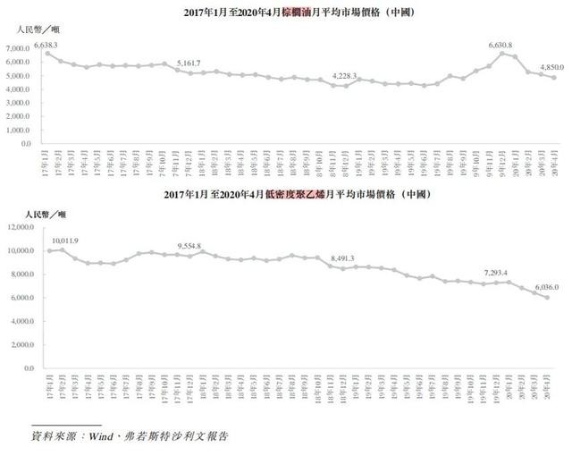 2017年至2019年,蓝月亮原材料成本分别占销售成本的79.5%、90.6%及81.5%。其中,棕榈油是主要化学品之一,而低密度聚乙烯是主要包装材料之一。而在报告期内,这两个主要原材料的价格都在持续下降。