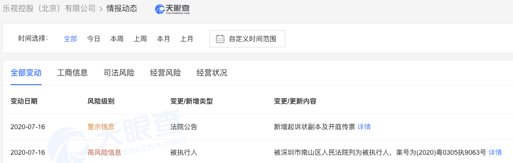天眼查数据显示,7月16日,乐视控股(北京)有限公司因与霍尔果斯乐视新生代文化传媒有限公司相关债权转让合同纠纷被深圳市南山区人民法院列为被执行人,案号为(2020)粤0305执9063号,执行标的为9583801元。