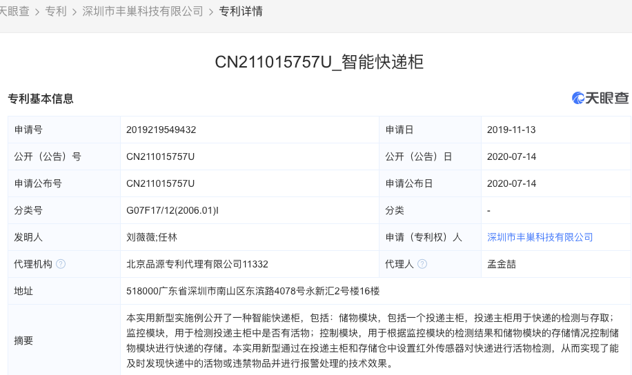 天眼查数据显示,7月14日,深圳市丰巢科技有限公司新增两项专利申请,包括资产编码管理方法、装置、服务器和存储介质,以及智能快递柜。其中,智能快递柜的专利类型为实用新型,专利摘要显示,本实用新型通过在投递主柜和存储仓中设置红外传感器对快递进行活物检测,从而实现了能及时发现快递中的活物或违禁物品并进行报警处理的技术效果。
