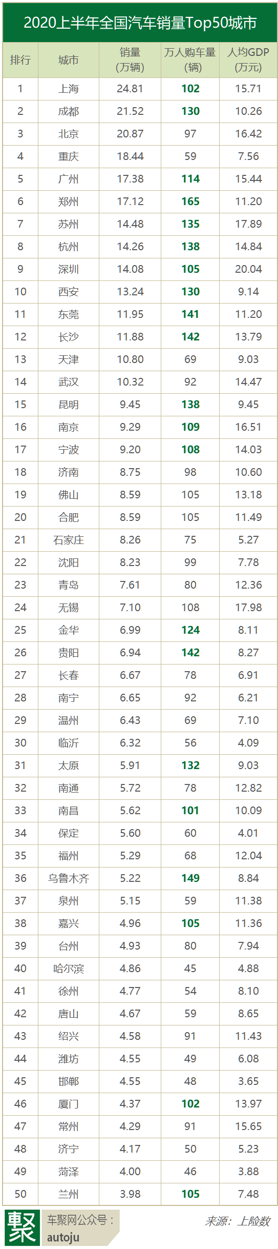 第二、第三的分别是成都和北京,上半年汽车销量分别为21.52万辆和20.87万辆。它们和上海是销量唯三突破20万辆的城市。