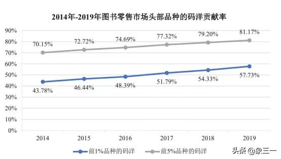 值得注意的是,在图书零售市场上,头部畅销书的码洋贡献率持续提升。2014 年至 2019 年, 最畅销的 1%图书品种的码洋贡献率从 43.78%逐年增加至 57.73%,前 5%图书品种的码洋贡献率从 70.15%上升至 81.17%。也就是说,畅销书已经成为拉动图书零售市场发展的重要力量,也是出版社、民营图书公司的主要利润来源。