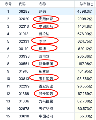 总体来说,市场公认的服饰模块增长潜力排行榜是:运动>童装>男装>女装。与此对应的港A两地中概股中,运动品牌的上市公司表现情况也要远高于其他品牌。在港股服饰品牌市值排在前15位的上市公司中,和运动品牌相关的公司占据半壁江山。