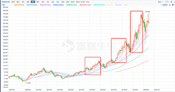 安踏业绩的变化,也体现在了资本市场上。从下图安踏的表现来看,三次大的飞跃分别对应在2014年-2015年,2017-2018年,以及2018年-2019年。