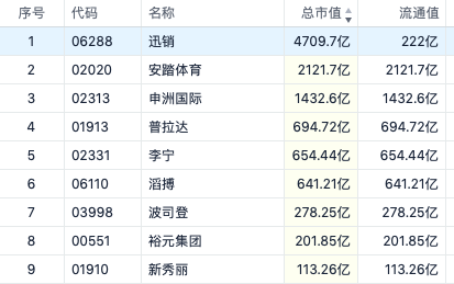 但是在港股市场,市值达到百亿的有9家,市值最高的迅销集团,也就是优衣库的母公司,市值高达4700亿港元。此外,排名第二和第三的安踏体育和申洲国际的市值也是千亿港元水平。