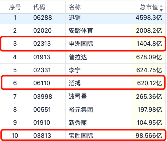 从港股7月10日的市值来看,这三家紧紧“抱住”耐克和阿迪达斯“大腿”的公司,在服饰板块的前十中都占有一席之地,且负责生产的申洲国际已经达到了千亿级别的市值,仅次于巨无霸迅销和最近风头极盛的安踏体育,滔博和宝胜国际分别有620亿和99亿。