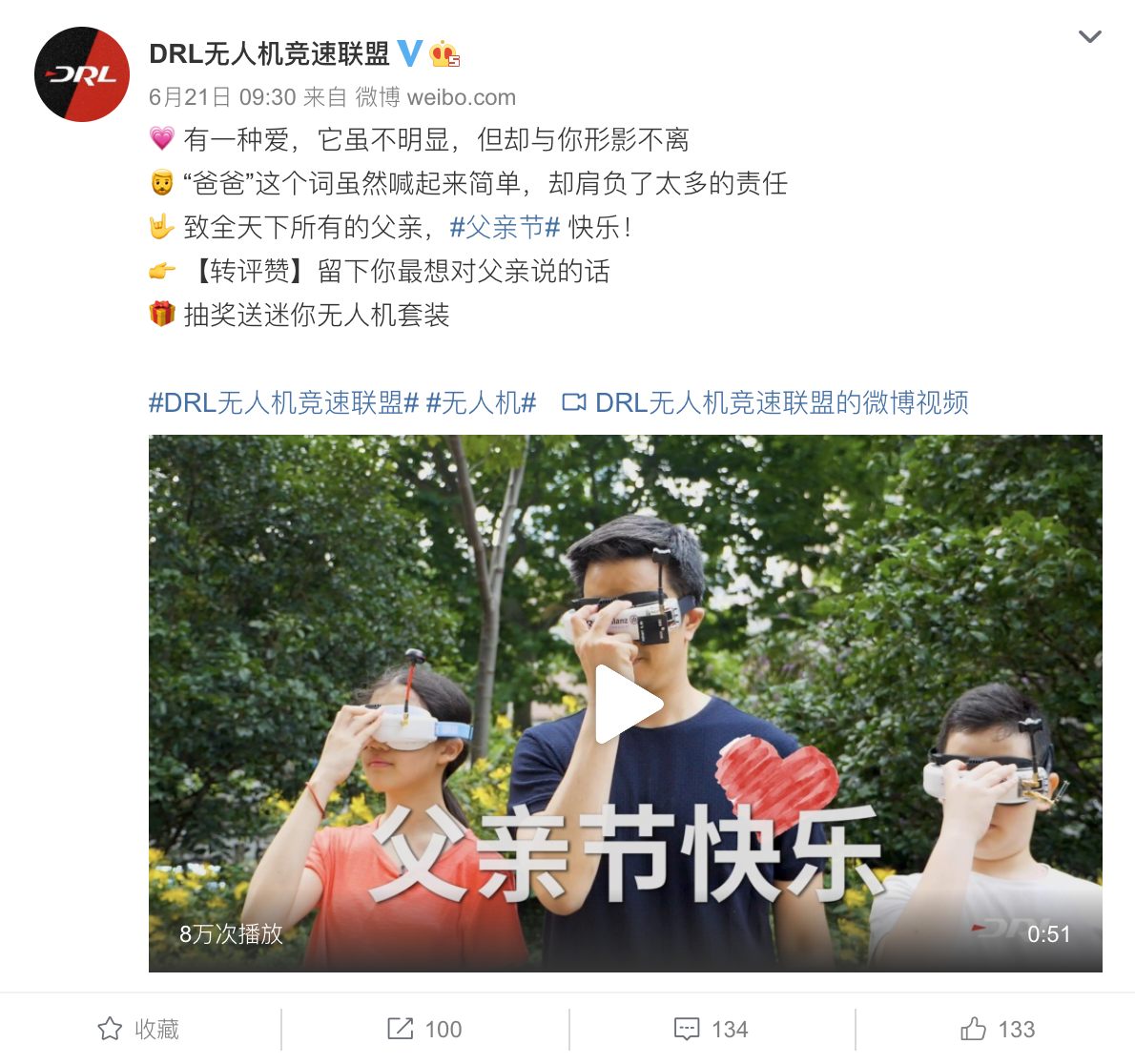 比竞争对手DCL晚了两年在国内办比赛的DRL,这次在中国的本土营销上下了大功夫。去年开始,除了高调签约中国飞手、宣布要在上海办比赛,DRL在社交媒体上也十分活跃。其主要阵地微博目前有110万粉丝,发布了许多赛事的直播与录播视频。此外,DRL也与优酷达成流媒体合作,据介绍,其比赛视频目前有超过7000万的观看量。