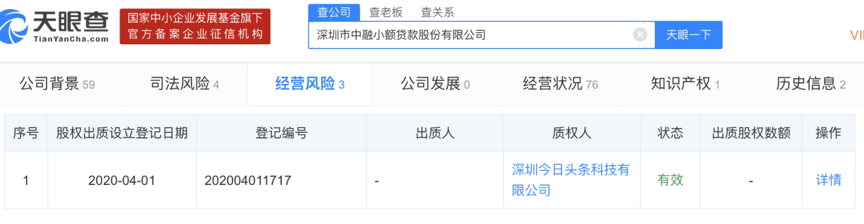 仅从披露的股权架构上来看,字节跳动并不是中融小贷的直接关联股东,不过,在今年4月中融小贷新增的一条股权出质信息显示,质权人正是字节跳动旗下深圳今日头条科技有限公司(如下图)。