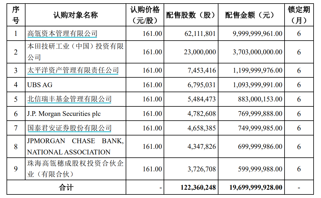 最终成功入围者中,高瓴资本在发行完成后将持有宁德时代0.53亿股股份,占公司总股本比例的2.27%,位列公司第九大股东。本田投资将持有宁德时代0.23亿股股份,占公司总股本比例的1%。值得一提的是,本次成功认购6亿元的珠海高瓴穗成股权投资合伙企业(有限合伙)和高瓴资本存在关联关系。这意味着,高瓴资本实际上投资了106亿元加仓宁德时代。