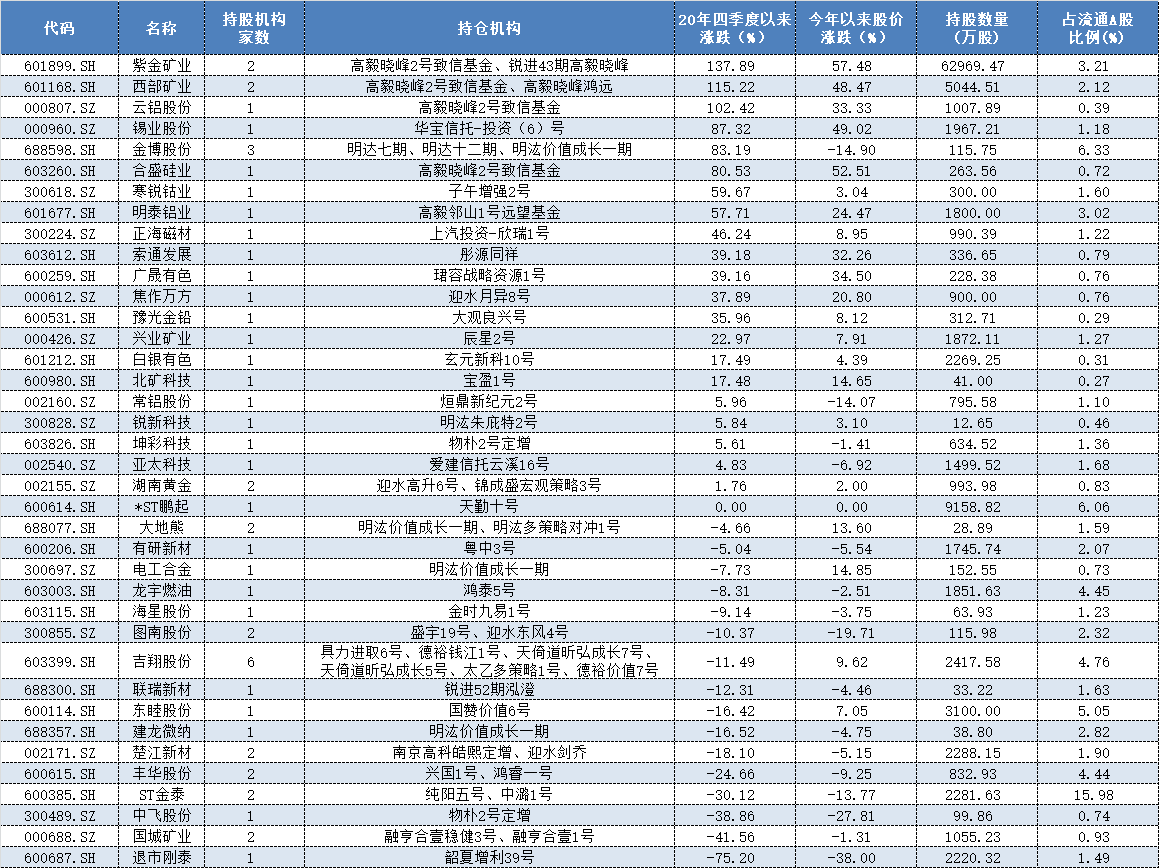 值得注意的是,除了紫金矿业之外,高毅资产去年三季报时还出现在西部矿业(601168.SH)、云铝股份(000807.SZ)、合盛硅业(603260.SH)、明泰铝业(601677.SH)等多只有色金属板块个股的前十大流通股东之列。按照去年四季度以来的股价涨幅来看,上述个股在私募重仓的38只有色金属个股中分别排在第二、第三、第六和第八位。
