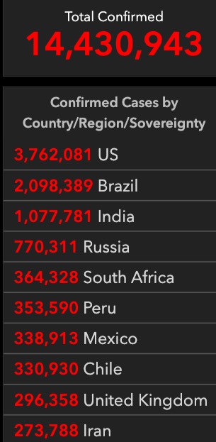 约翰·霍普金斯大学的统计数据显示,截至北京时间7月20日上午7点34分,全球累计确诊新冠肺炎病例14430943例,死亡604725例。