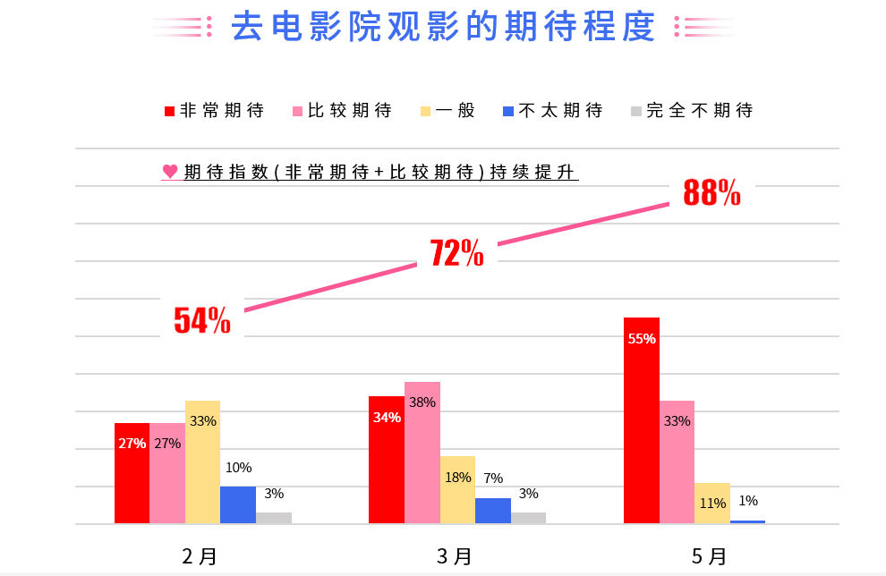 根据猫眼娱乐等推出的《2020上半年度电影市场数据洞察》资料显示,观众期待指数从2月份的54%迅速拉升至5月的88%,近乎九成。调研结果显示,表示“近期不会”与“今年不会”去电影院的占比持续下降,6月超过半数公众表示“太想念”影院。