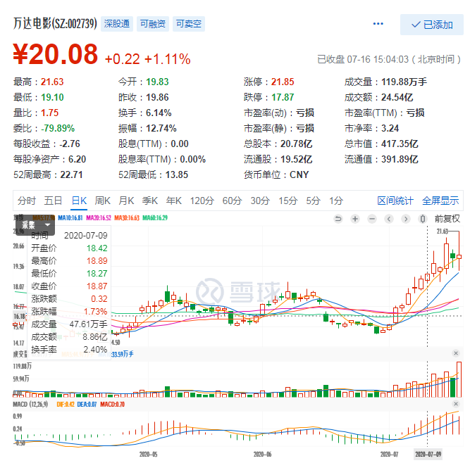 根据文娱商业观察的统计,院线股龙头万达电影股价从6月30日收盘价的15.27元/股上涨至7月16日的20.08元/股,半个月的时间累积涨幅达到31.5%,远远跑赢大盘。