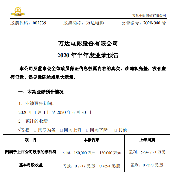 这些都是估算,难以完整描述停业行业的冲击。最新的万达电影半年报业绩预告数据显示,万达电影在上半年预计亏损15-16亿元,公司下属 600 余家国内影城自 2020 年 1 月 23 日起全部停业,境外影城也自 2020 年 3 月底暂停营业,给公司带来了巨大的财务压力。