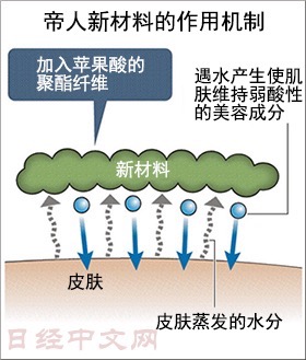 此外,当皮肤中的水分蒸发时,纤维还能遇水发生反应,生成美容成分。这种制衣纤维能在经过50次清洗之后仍能保留大部分苹果酸。