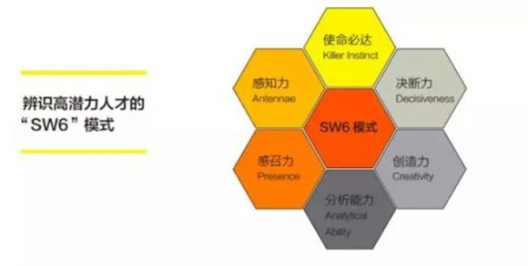 那么,如何找到比自己更为优秀的高潜力人才呢?根据我们对全球各地诸多领导者的接触和观察,高潜力优秀人才身上具备一些相似的特质。我们将其归纳为独特的“SW6”模式(6 Strengths & Weaknesses),即:使命必达(Killer Instinct)、决断力(Decisiveness)、创造力(Creativity)、分析能力(Analytical Ability)、感召力(Presence)以及感知力(Antennae)。