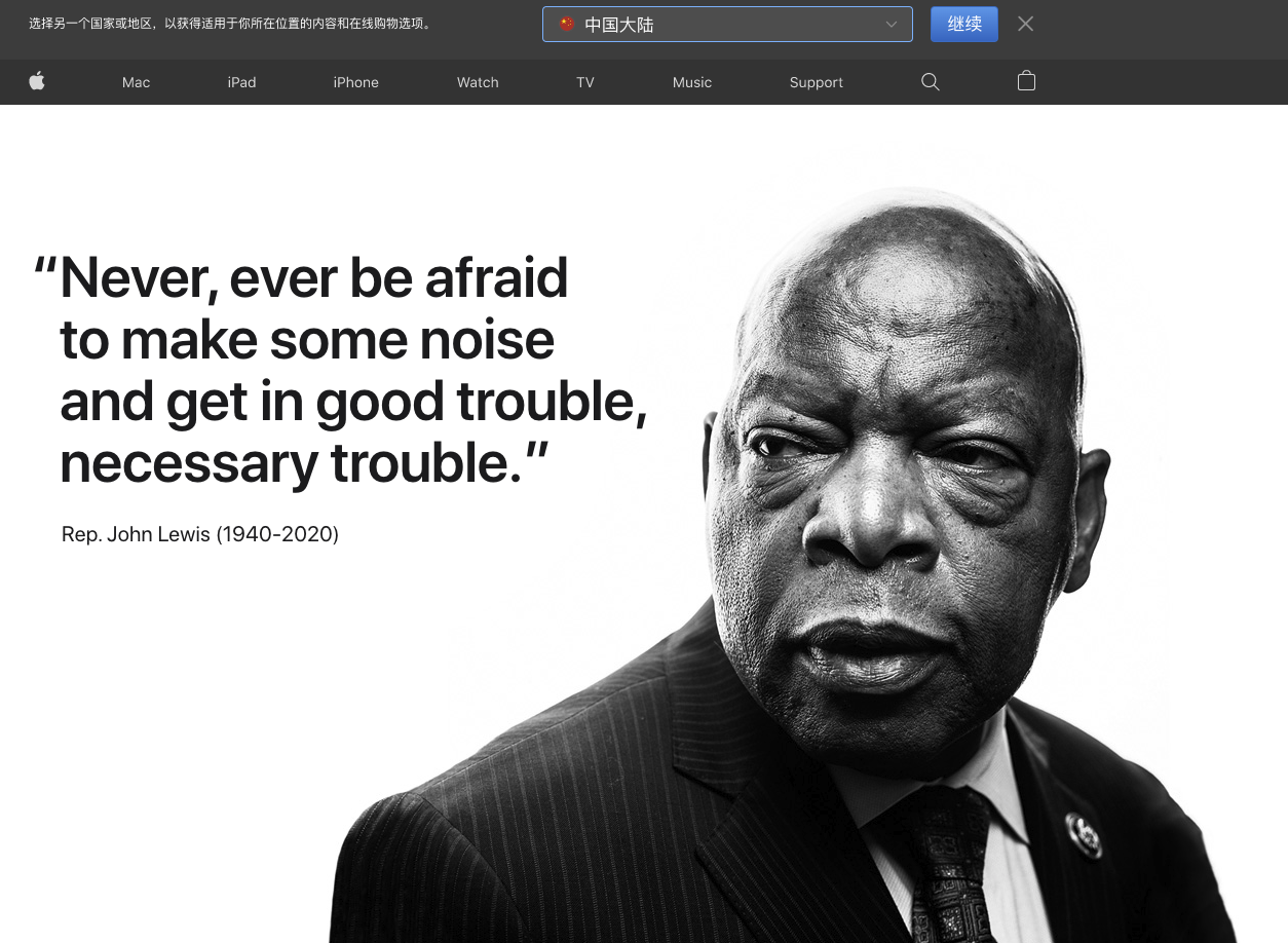 苹果官网上出现了约翰·刘易斯的大幅照片,以及他的一句格言:“永远,永远不要害怕制造噪音和惹上好的麻烦,必要的麻烦”。