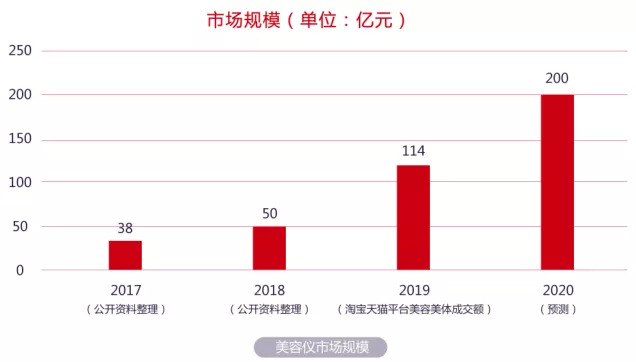 近期,由青眼情报、青眼与美得得联合出品发布的《美容仪产品市场洞察报告》(下称报告)显示,美容仪市场呈快速增长之势,由2017年38亿元的市场规模,到2019年,仅淘宝天猫平台美容美体类仪器销售额就达114亿元,业内人士预测到2020年年末,美容仪市场规模将达200亿。在调查的全国19个省份的多名资深消费者(同时也是业内人士)中,有约87%的人看好美容仪市场前景。
