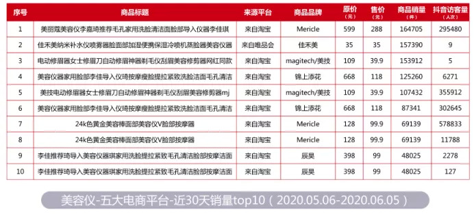 从线上销售情况来看,(淘宝、京东、考拉海购、唯品会、苏宁易购)五大平台统计范围内近30天的美容仪销量top10产品均为国产品牌,如Mericle、佳禾美、magitech/美技、锦上添花、辰昊。上榜类型包括:洁面导入仪、蒸脸器、电动修眉刀、按摩器,产品定价均在300元以内。