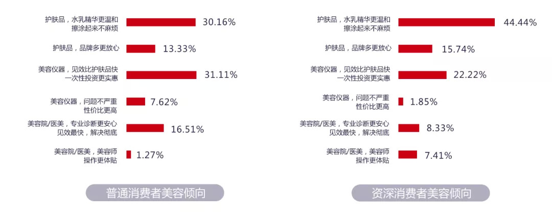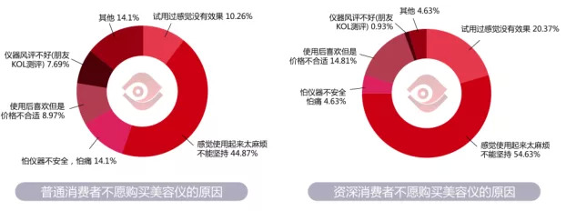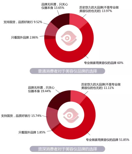 报告显示,普通消费者对美容仪的需求倾向甚至超过了护肤品。主要因为美容仪见效比护肤品快,一次投资更实惠。而大部分的资深消费者则更倾向于选择护肤品,理由是护肤品更温和,擦涂起来不麻烦。