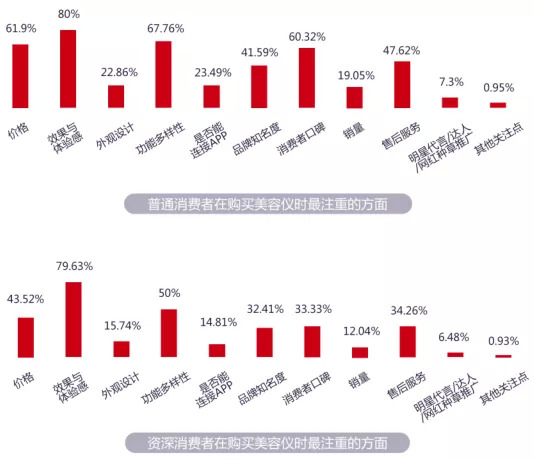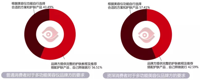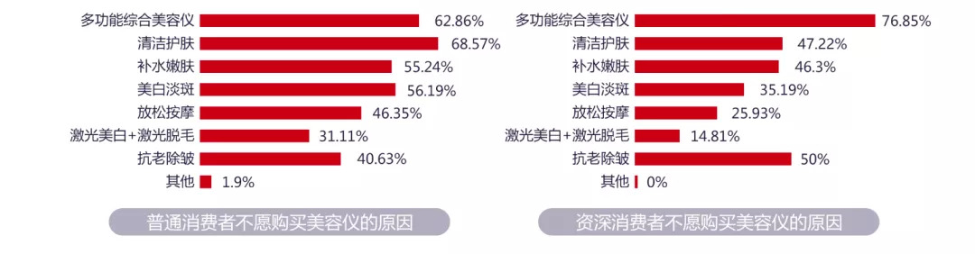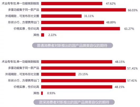 从功能来看,在参加调研的人群中,普通消费者对于清洁护肤类美容仪呼声最高,资深消费者更渴求多功能综合美容仪。