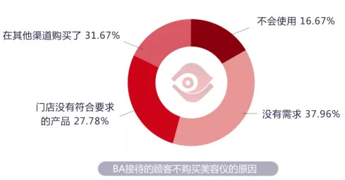 报告显示,在调研的108位BA中,有90%的BA表示其接待的消费者中购买美容仪比例低于30%,BA接待的顾客恰好要购买美容仪的产品概率仅为16.9%。其中,37.96%的BA表示其接待的顾客不购买美容仪的原因是没有这方面的需求,27.78%的BA则表示是由于门店没有符合要求的产品。由此可见,美容仪在线下渠道的销售并不顺利。