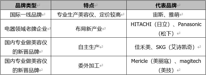 从品牌类型来看,目前国内市场上的美容仪品牌主要分为四类, 分别为以宙斯、雅萌为代表的国际一线品牌;以日立、松下为代表的电器领域老牌企业;自主生产的国内美容仪新晋品牌,如佳禾美、SKG;Mericle、magitech/美技等为代表的委外加工的国内美容新晋品牌。