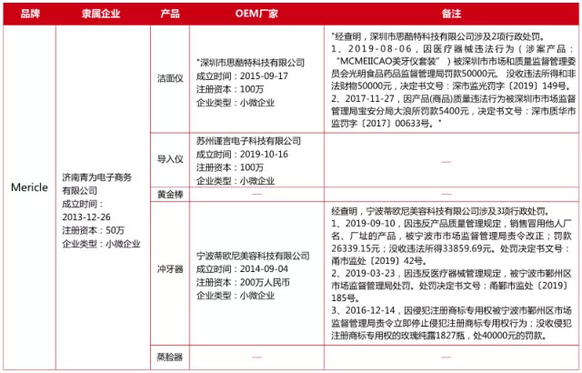 其中,Mericle在淘宝平台近30天(2020.05.10-2020.06.05)的美容仪销售榜单上排名第一。不过,根据调查,其委托代工的两家工厂深圳市思酷特科技有限公司和宁波蒂欧尼美容科技有限公司均曾因违规生产被监管部门处罚过。