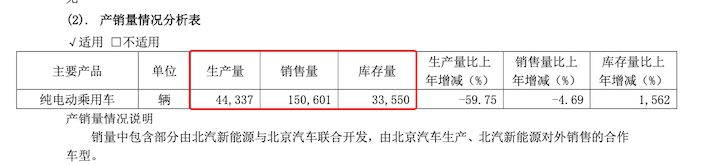 根据北汽蓝谷发布的2019年年报,其2019年产量为4.4万辆,销量15万辆,库存3.3万辆,产销差距达到10万辆。根据这一数据,在2019年15万的销量中,或有大部分为2019年之前生产的库存,而在2019年生产完4.4万辆后,仍有3.3万辆转为库存。