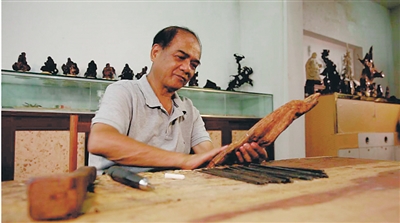 钟振中介绍,选材是根雕制作的第一步,他选材遵照稀、奇、古、怪四个特点,而一般只有生长在恶劣环境中的根材才能满足这些特点。如背阳生长或悬崖峭壁石缝中,由于光照不足缺土少水乏养分,久长不大,渐渐变形,年愈久,质愈坚,造型也愈奇崛遒劲,是根艺的理想用材。