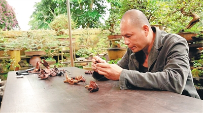 海南还有一位黄花梨根雕匠人名叫彭锦平,养花品茗,彭锦平的生活方式很纯粹。
