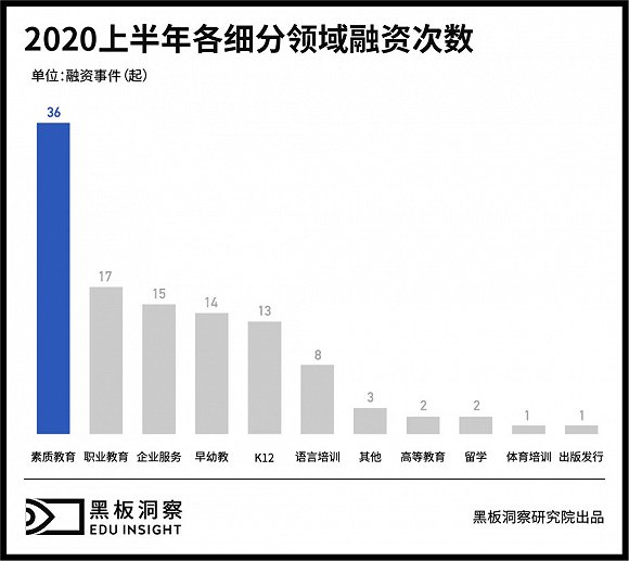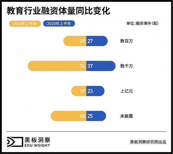 整体来看,2020年上半年教育行业共发生了113起投融资事件,比2019年同比减少32.34%,比2018年同比减少66.96%。