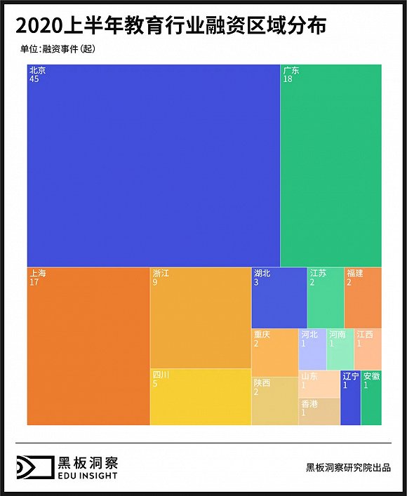 在融资事件地域分布上,上半年共16个地区发生了教育融资事件。北上广深地区共发生了80起融资事件,占比71.43%。其中,北京地区发生融资事件最多,为45起,占比40.18%。