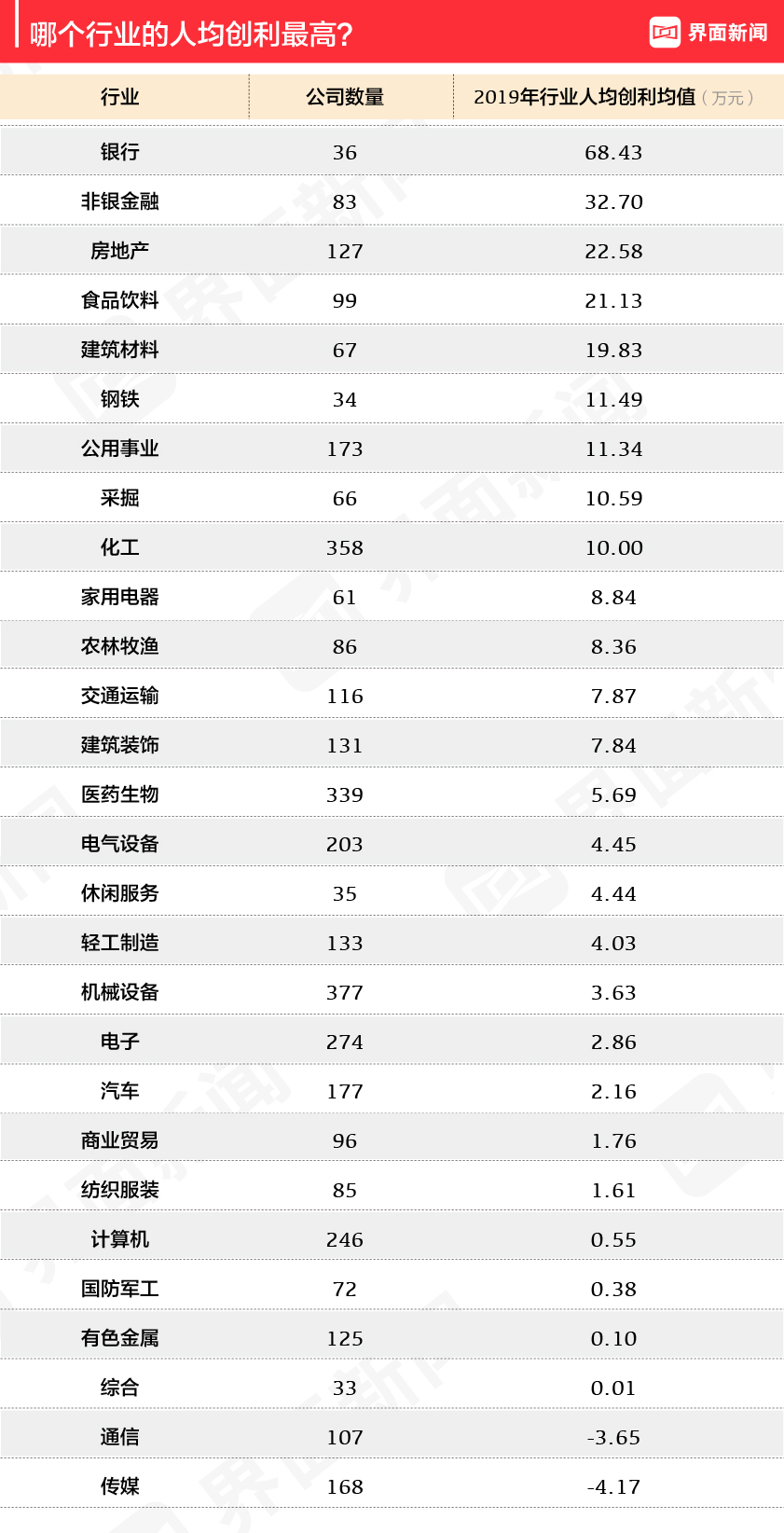 在中国A股上市公司中,银行业人均创利均值达到了68.43万元,在28个行业中位居第一,但是公司数量仅有36家;其次是非银金融,人均创利均值超过了32万元;房地产行业以人均创利均值22.58万元排在了第三名。然而,通信行业和传媒行业分别以人均创利-3.65万元和-4.17万元的数据垫底。