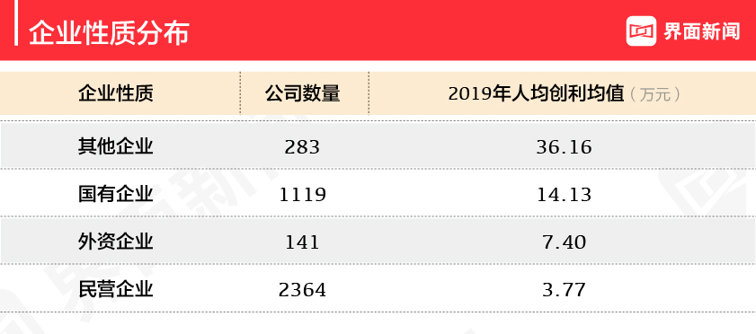 在3907家A股上市公司中,其他企业(包括集体企业、公众企业等)的人均创利为36.16万元,位列第一;国有企业以人均创利14.13万元位于第二,公司数量也位居第二(1119家)。值得注意的是,尽管民营企业的公司数量有2364家,是其他企业的八倍左右,但是人均创利仅有3.77万元,大约为其他企业人均创利数据的十分之一。