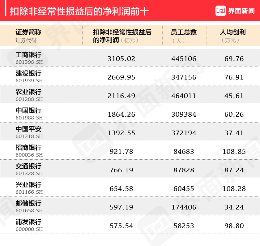 据统计,中国A股上市公司在2019年扣除非经常性损益后的净利润达到了34364亿元,其中扣除非经常性损益后的净利润最高的是工商银行,超过了3105亿元,但由于员工总数超过了44万人,因此人均创利仅有69.76万元。此外有趣的是,扣除非经常性损益后的净利润前十均为金融企业;并且除了中国平安以外,均为银行。