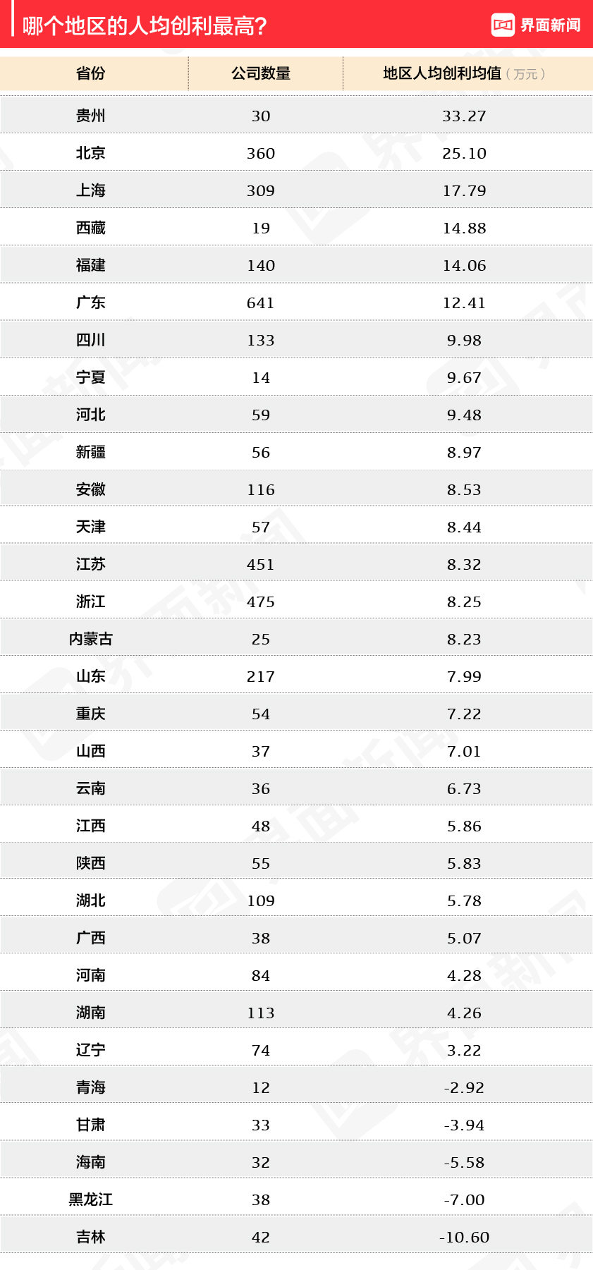 根据统计,3907家A股上市公司覆盖中国31个省份,其中贵州以人均创利33.27万元排在第一名,主要归功于贵州茅台,贵州茅台的扣除非经常性损益后的净利润(414.07亿元)占贵州扣除非经常性损益后的净利润的80%左右,因此拉高了贵州的人均创利水平。北京位居第二名,人均创利达到了25.10万元,但是北京的公司数量是贵州省的十二倍;上海以超过17万元的人均创利数据拿下第三名。但是海南、甘肃、黑龙江、吉林和青海的人均创利均值为负数,暂居于地区排名之后。