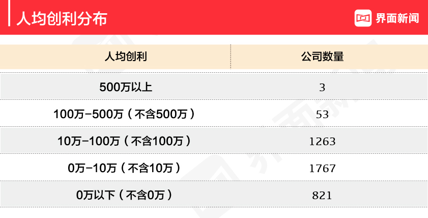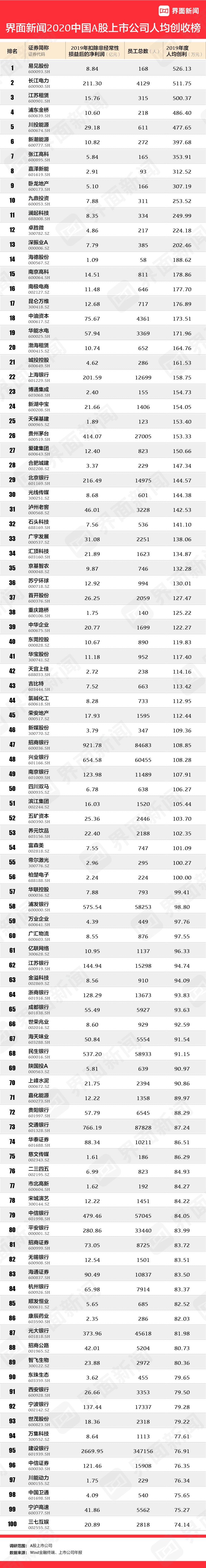 人均创利是衡量企业业绩的一项重要指标。同样是对盈利能力的判断,净资产收益率是从资本的角度看盈利能力的强弱,而人均创利是从人的角度去分析公司盈利能力的高低。一般情况下,人均创造利润越高,说明员工的生产效率越高、对企业的贡献越大。因此,界面新闻推出了2020年中国A股上市公司人均创利榜单作为参考。