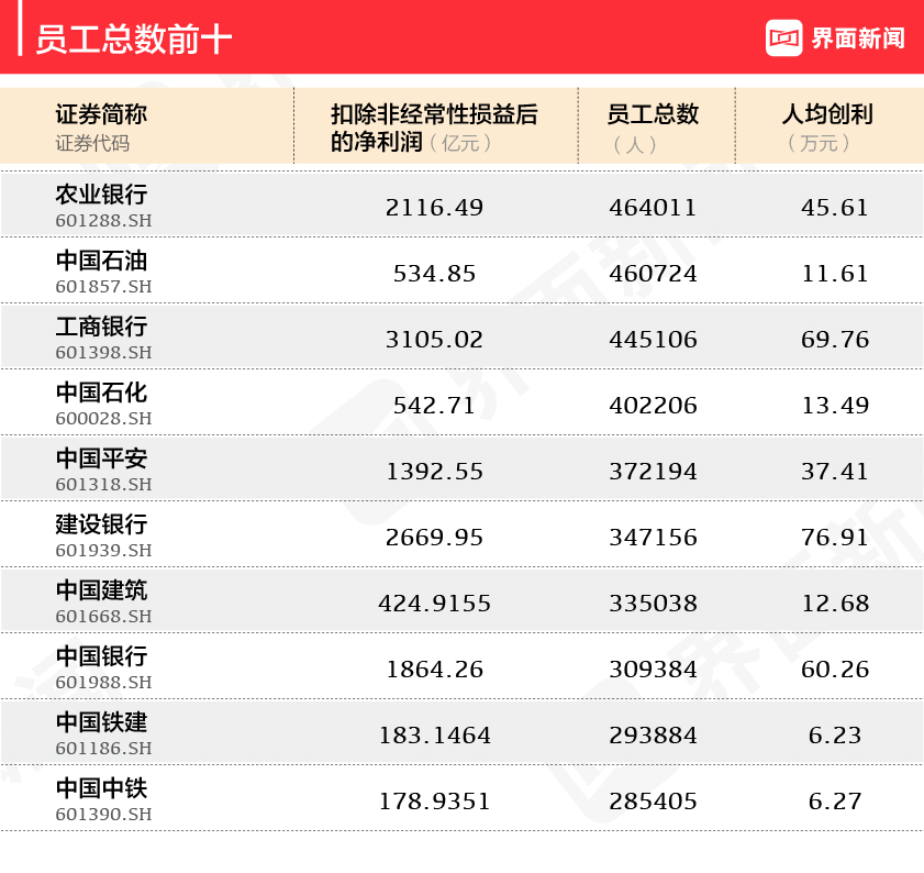 据分析,中国A股上市公司共有员工人数达到2460万,其中农业银行位列第一,员工人数超过46万,人均创利处于中间水平在45万元左右。不同的是,中国石油的员工总数也在46万名左右,但是人均创利仅有12万元,处于较低的水平,这主要因为农业银行的扣除非经常性损益后的净利润大约是中国石油的四倍。由此看来,农业银行的业绩水平或者说劳动效率高于中国石油。
